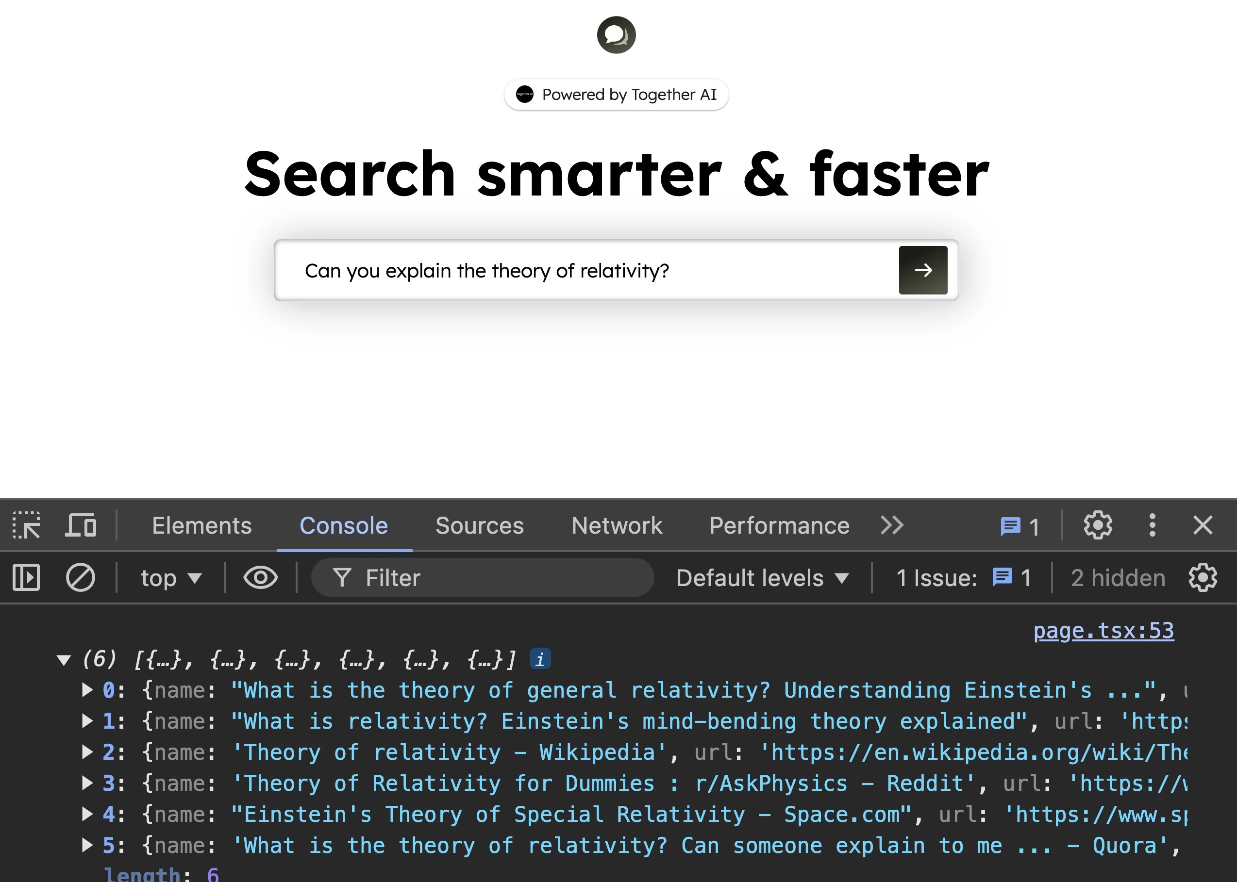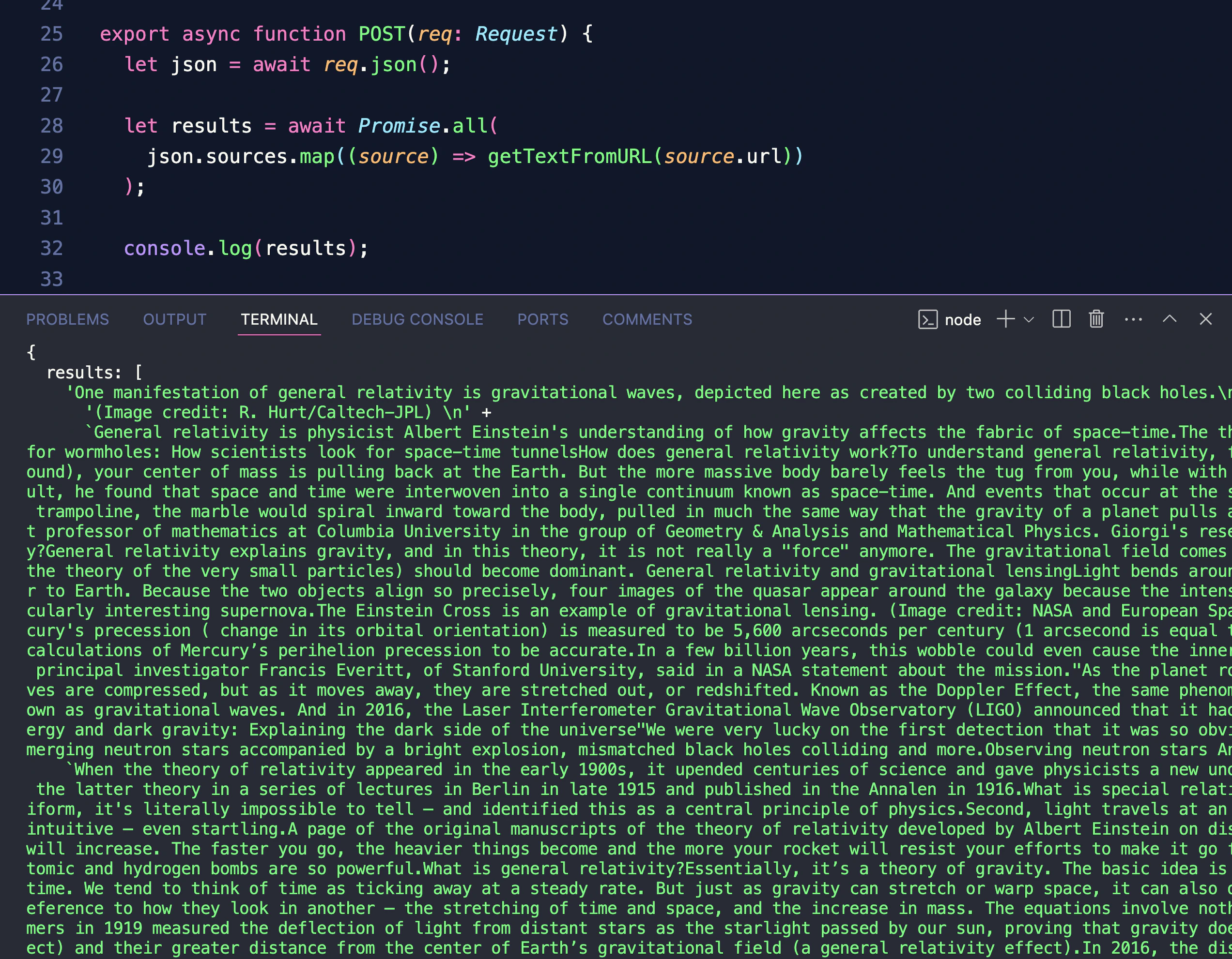 Now that we have the text content from each source, we can pass it along with a prompt to Together to get a final answer. Let’s install Together’s node SDK:JSX
