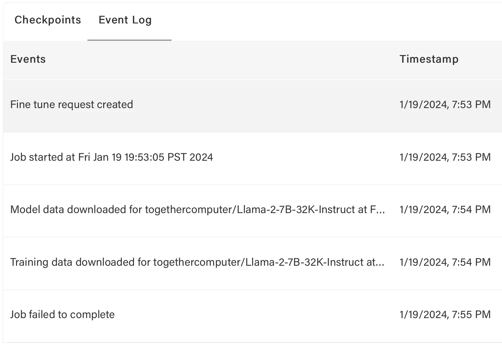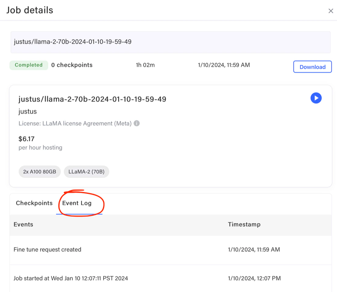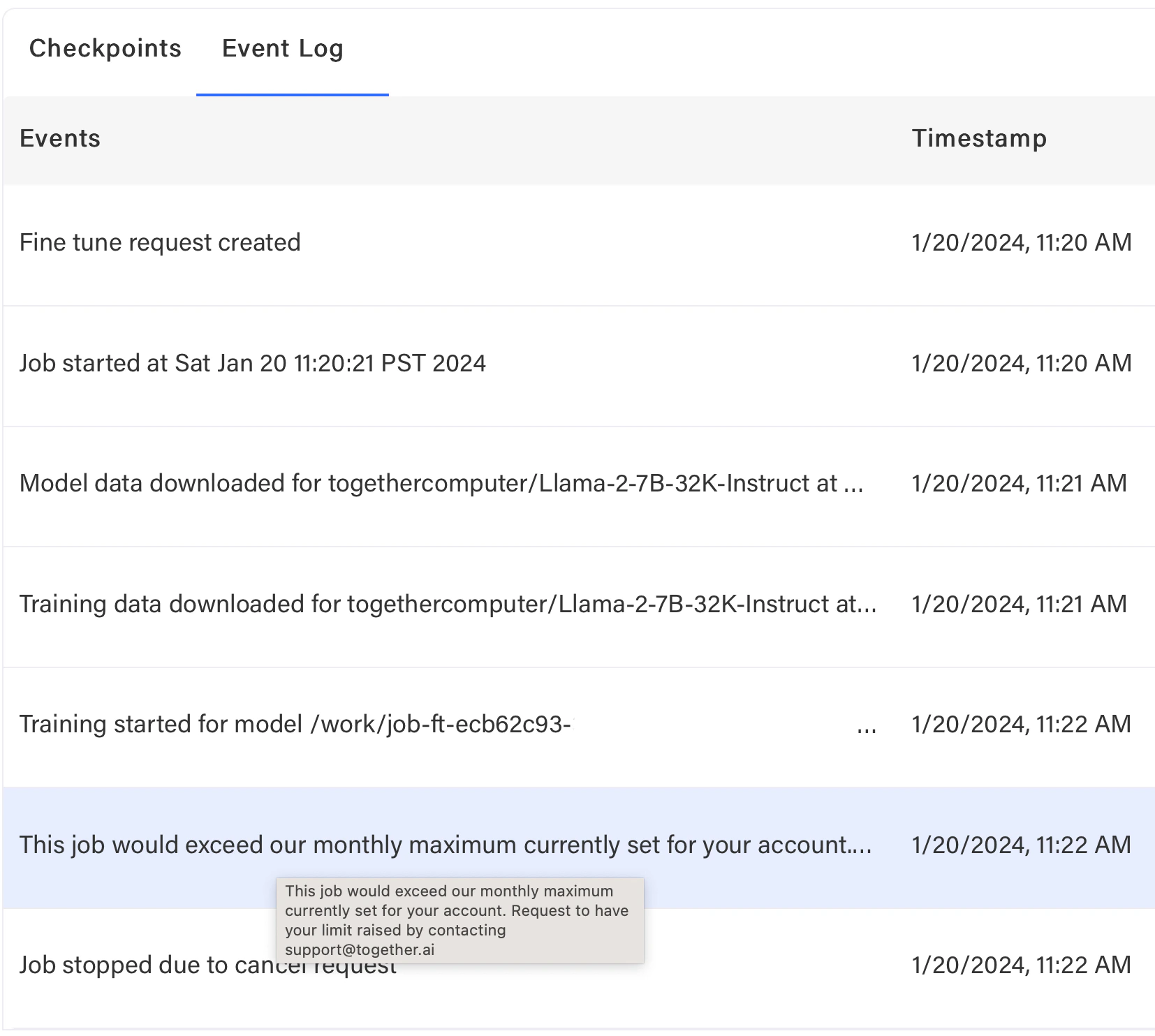 (2) Via the web interface https://api.together.ai > Jobs > Cancelled Job > Events List