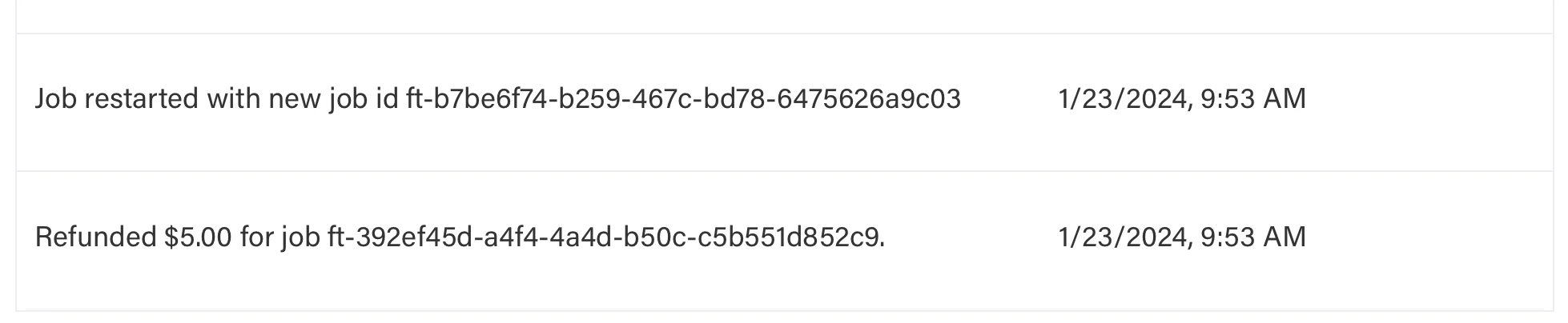 A job will be automatically or manually restarted if the job fails to complete due to an internal error. You can view the event log to see if the job was restarted, to determine the new fine tune ID of the restarted job, and check the refund amount (if applicable). Any charges from the failed job will be refunded when your job is restarted. An example event log for a restarted job is: