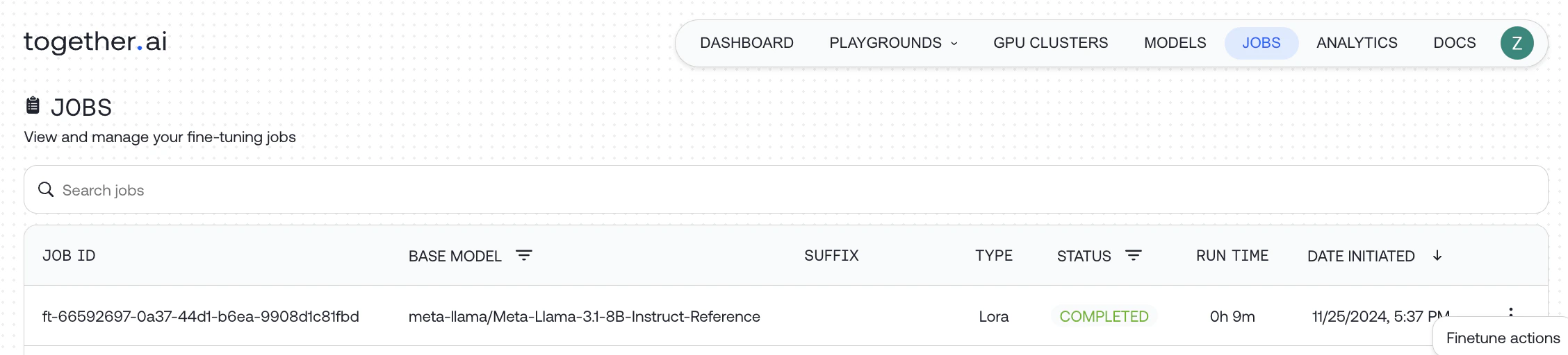 We support both LoRA and full fine-tuning – see how to start a finetuning job with either method below.status key that starts out as “pending”: