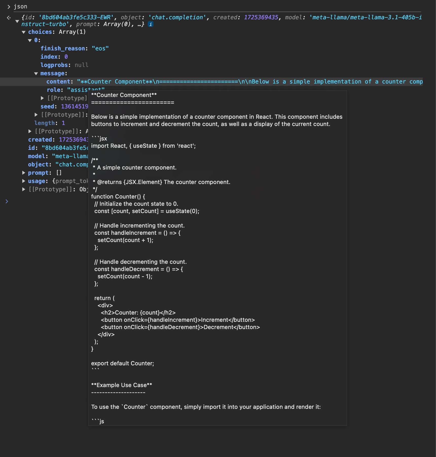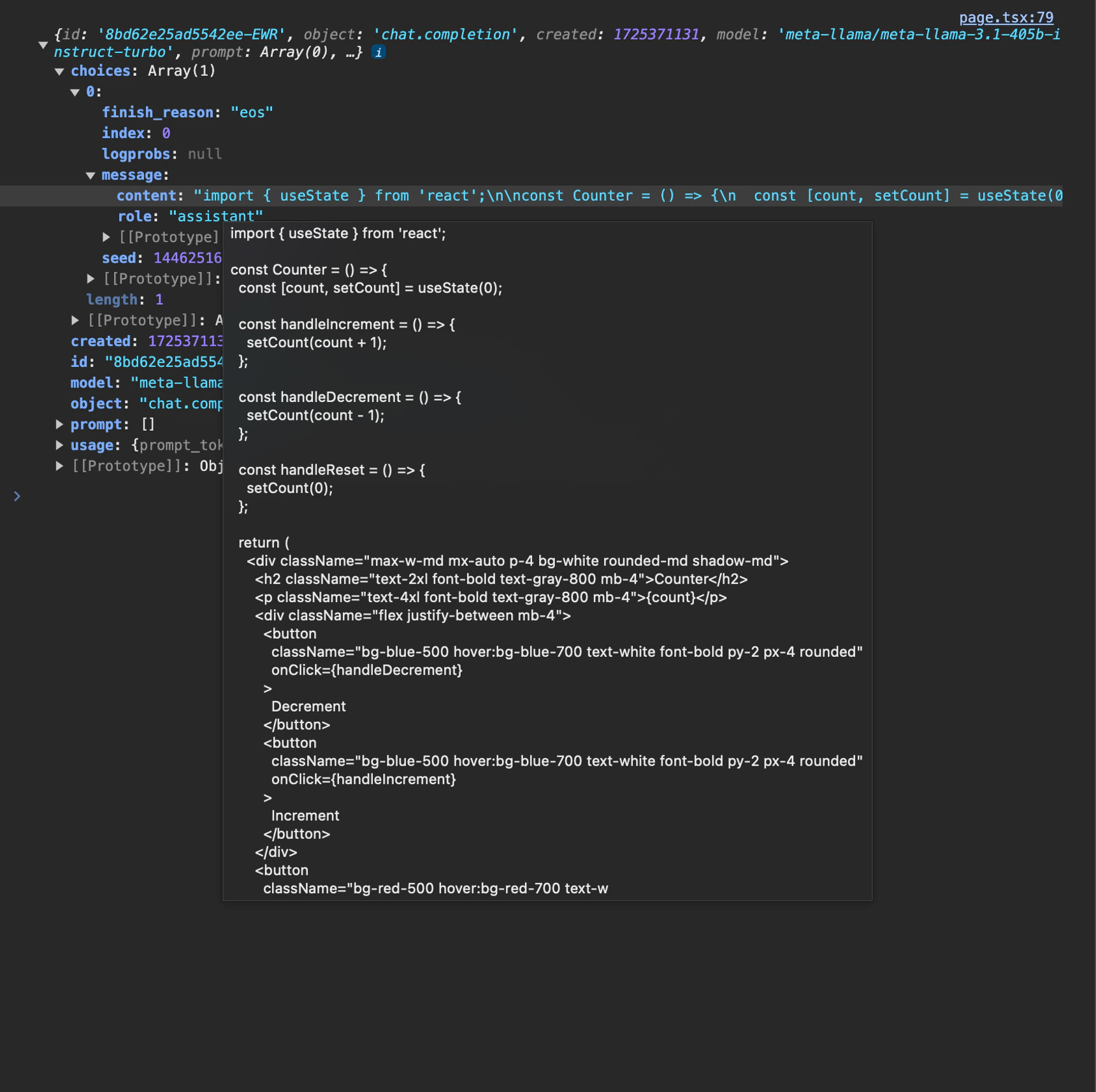 together.chat.completions.create to get a new response from the LLM. We’ve supplied it with a “system” message telling the LLM that it should behave as if it’s an expert React engineer. Finally, we provide it with the user’s prompt as the second message.
