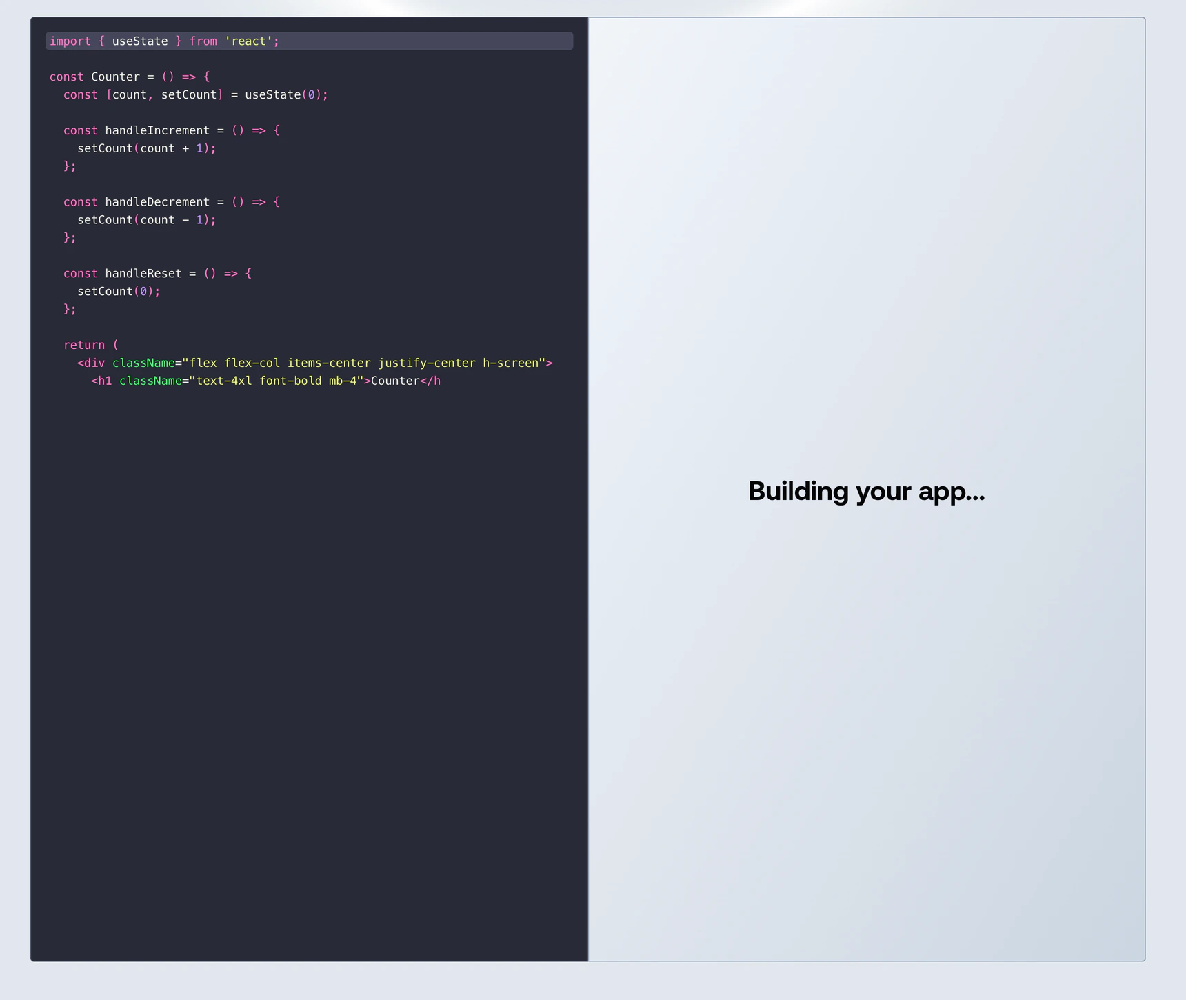 By setting generatedCode to the current text concatenated with the new chunk’s text, React automatically re-renders our app as the LLM’s response streams in, and we see <Sandpack> updating its UI as the generated app takes shape.