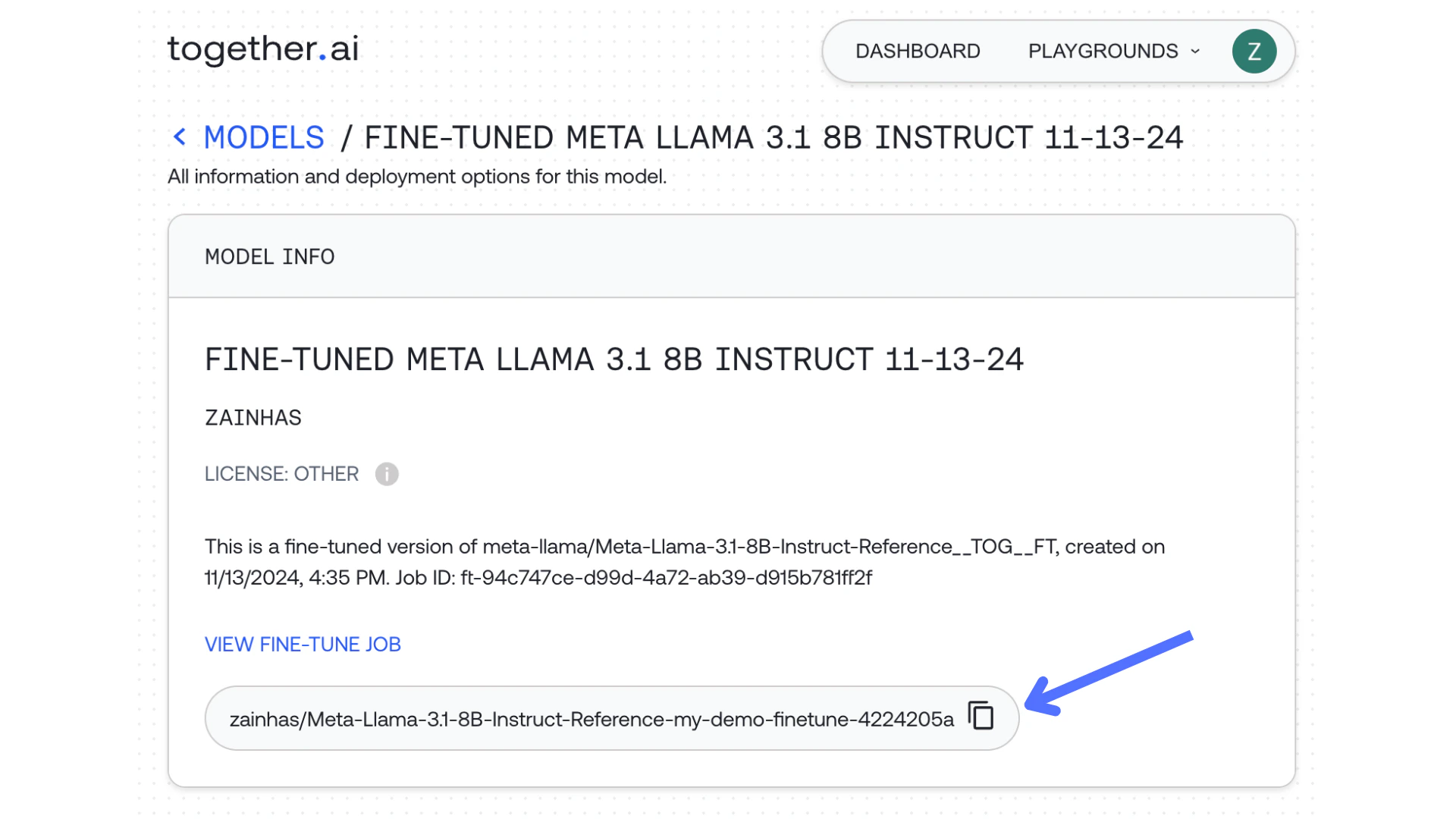 Once you submit the fine-tuning job you should be able to see the model name in the response: