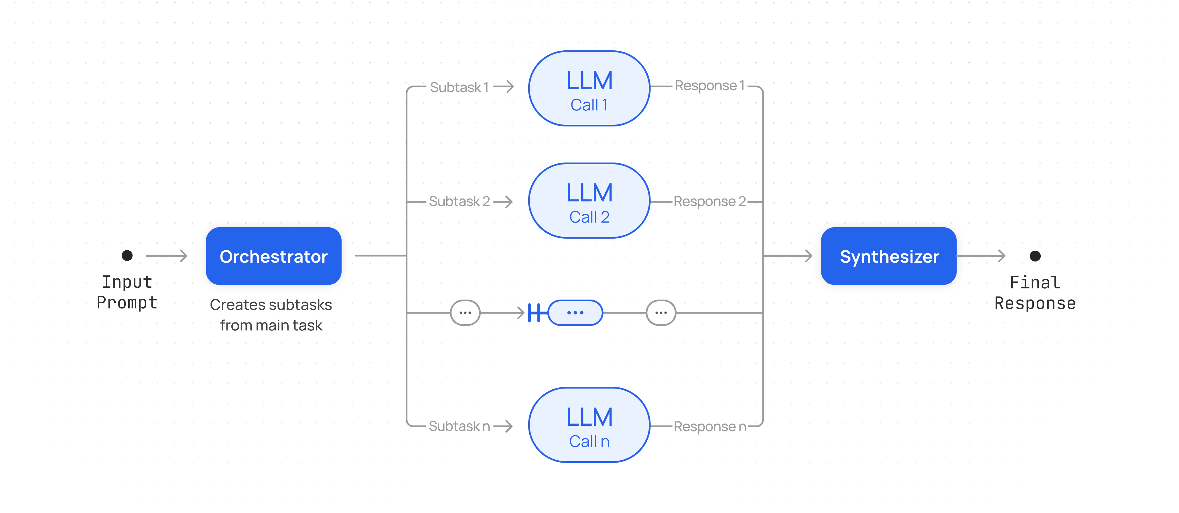 - Dividing a data analysis task into subtasks like cleaning the data, identifying trends, and generating visualizations. Each step is handled by separate worker LLMs, and the orchestrator integrates their findings into a complete analytical report.