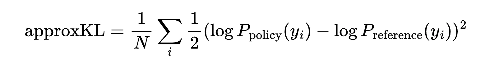 - KL Divergence — similarity of output distributions between the trained model and the reference model, calculated as: